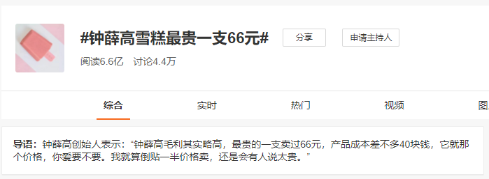 讀特客戶端·深圳新聞網(wǎng)2021年6月16日訊(記者 常軍平)16日下午,因最貴的雪糕賣66元,創(chuàng)始人還表示“愛要不要”上熱搜一事,鐘薛高進行了回應(yīng):“我們被惡意剪輯了”。