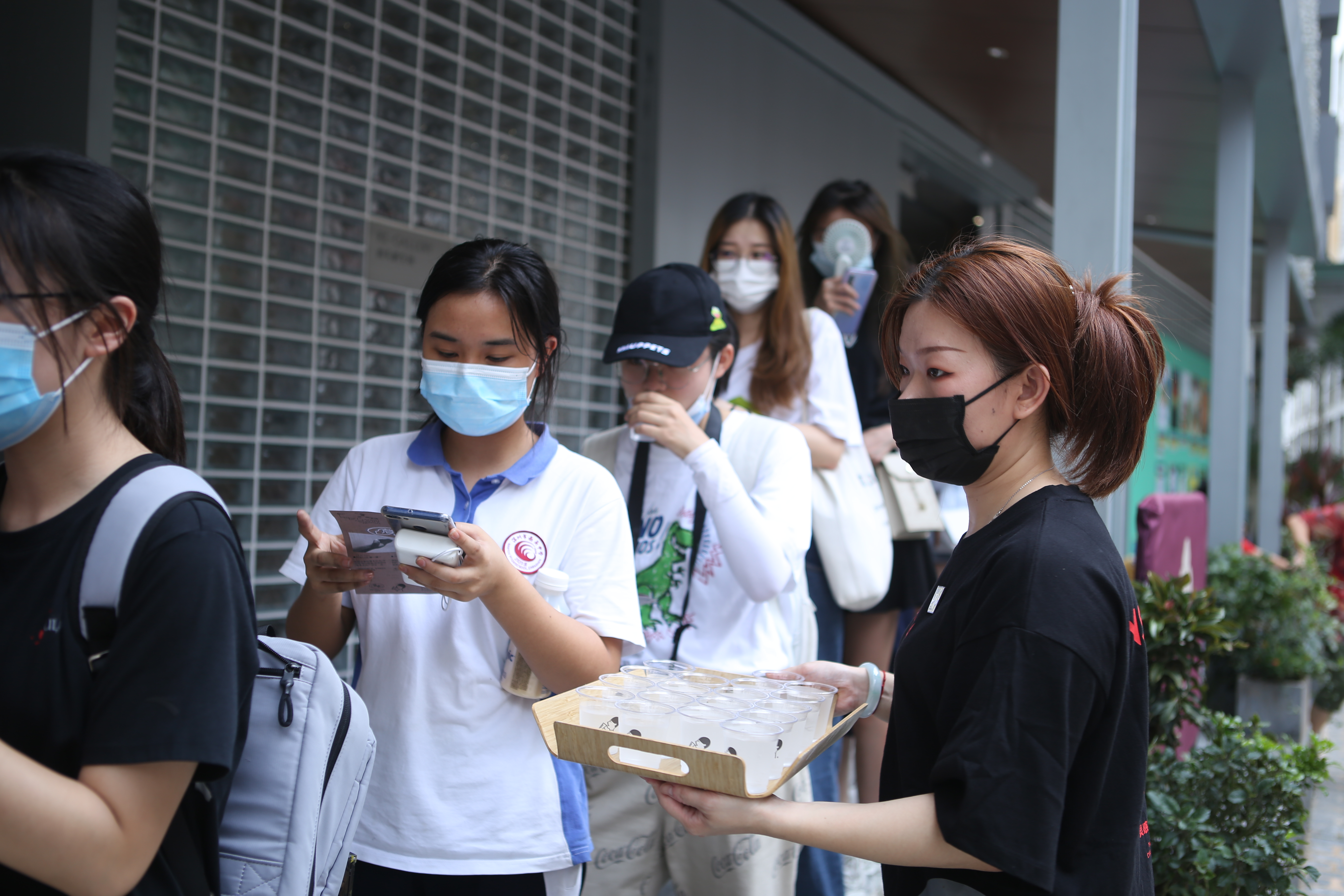(門店工作人員熱情地為排隊顧客送上茶飲解渴)