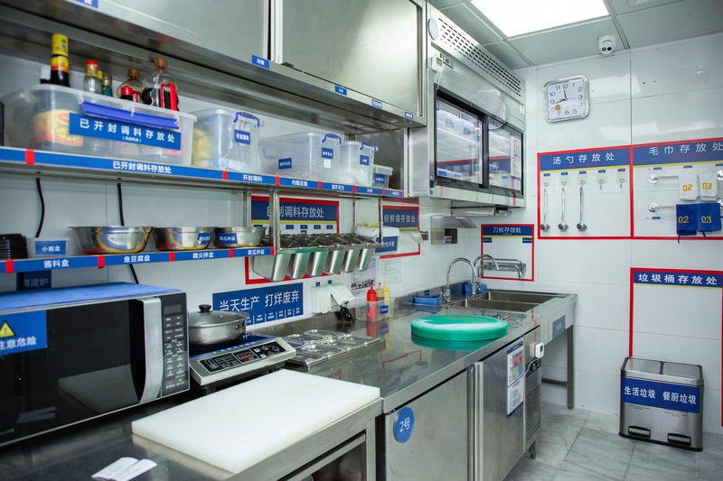 “右手邊是冷菜間,因?yàn)槭嘲惨蟾撸覀兌加袑iT的‘二次更衣室’,在這里更換衣服后,再進(jìn)入對(duì)涼菜進(jìn)行處理。”負(fù)責(zé)人表示,在專門的涼菜區(qū)里,則可以看到櫥窗中整齊地貼上了諸如“A1圣女果”“B04魚豆腐”之類的標(biāo)簽,同時(shí)備注“當(dāng)天生產(chǎn)打烊廢棄”和“加工日期與廢棄日期”等具體操作指示?!懊客泶蜢群螅覀円矔?huì)用紫外線燈對(duì)冷菜間進(jìn)行半個(gè)小時(shí)的消毒?!必?fù)責(zé)人補(bǔ)充。