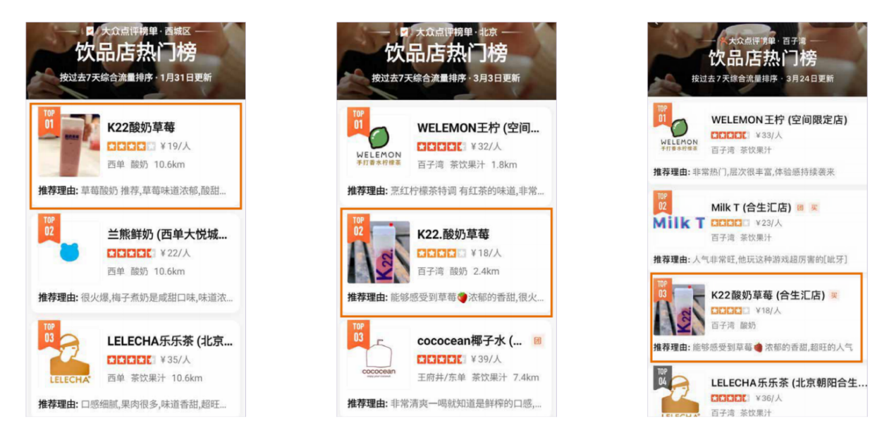 自帶流量的K22.酸奶草莓很快把店開(kāi)進(jìn)了北京一線商圈——西單大悅城,并在當(dāng)時(shí)火速登頂大眾點(diǎn)評(píng)西城區(qū)熱門(mén)榜 TOP1,成為當(dāng)之無(wú)愧的北京排隊(duì)王。