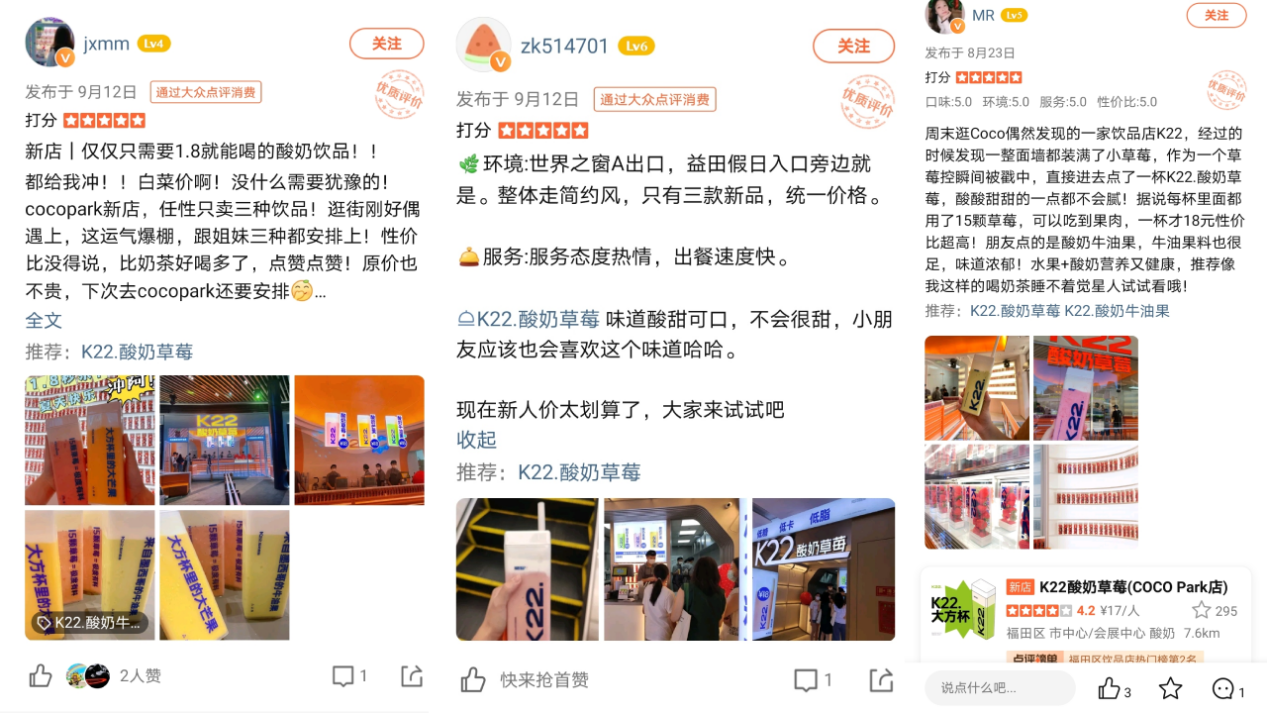 目前K22.酸奶草莓深圳門(mén)店已正式開(kāi)業(yè),試營(yíng)業(yè)期間已榮登大眾點(diǎn)評(píng)飲品熱門(mén)榜單并收獲了相當(dāng)不錯(cuò)的人氣和好評(píng),相信K22.酸奶草莓在深圳的市場(chǎng)發(fā)展一定能再創(chuàng)輝煌。