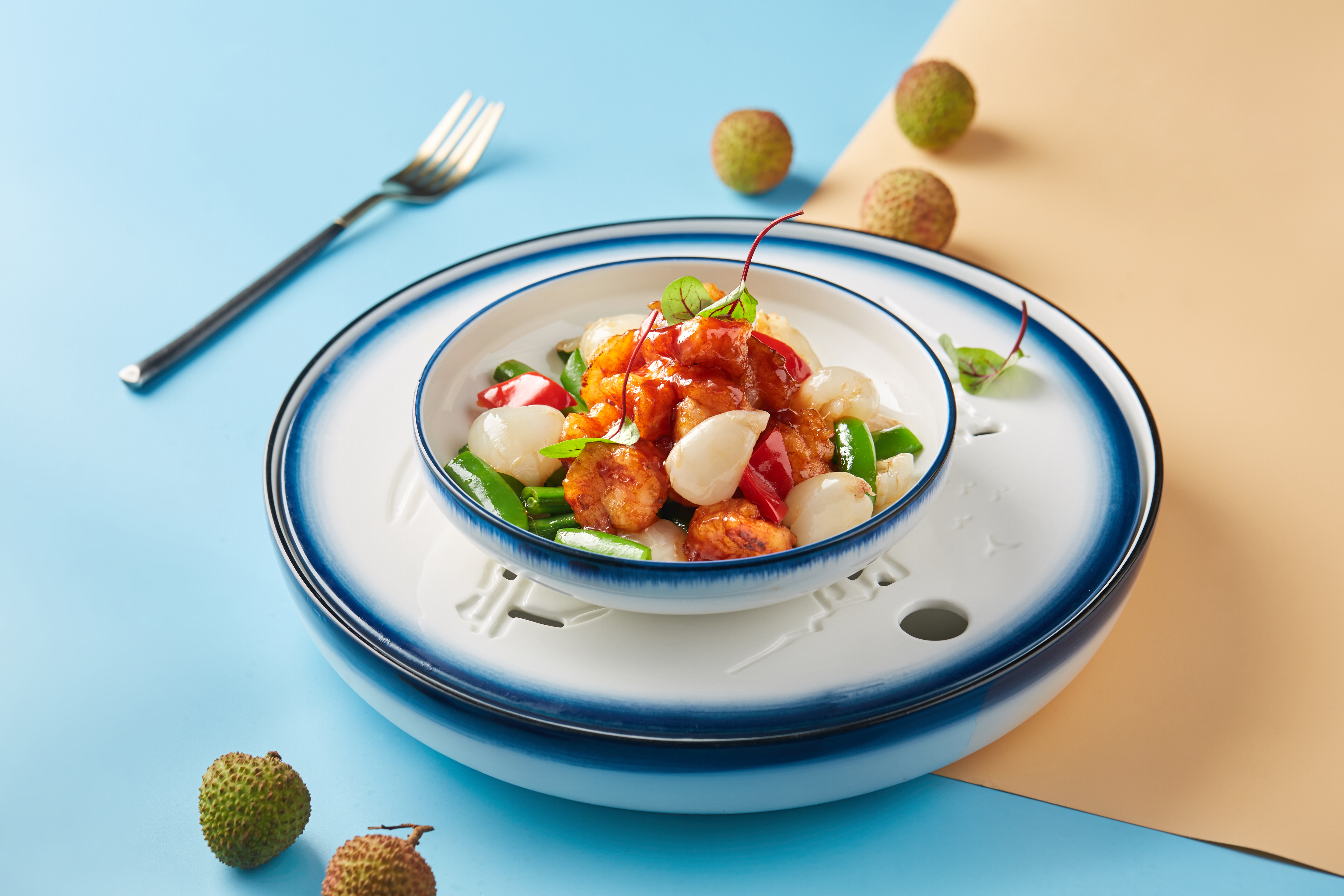粵菜師傅延續(xù)舊日食風(fēng),巧妙設(shè)計,將荔枝肉與蝦仁共燴-碧綠蝦仁炒荔枝肉.