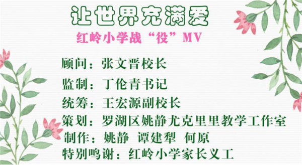 經(jīng)過學(xué)校老師、家長們的共同努力,3月23日,全長6分零6秒的紅嶺小學(xué)戰(zhàn)疫M(jìn)V《讓世界充滿愛》順利完成。該片通過紅嶺小學(xué)微信公眾號首發(fā),目前,已在深圳晚報(bào)、晶報(bào)、深圳新聞網(wǎng)等多家主流媒體平臺傳播。