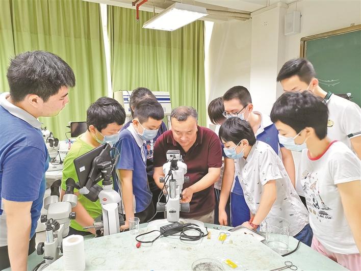 學(xué)生在老師的指導(dǎo)下進(jìn)行實(shí)驗(yàn)。