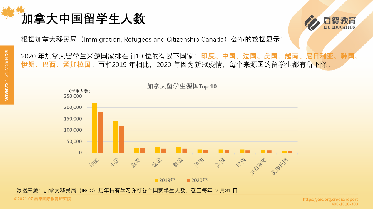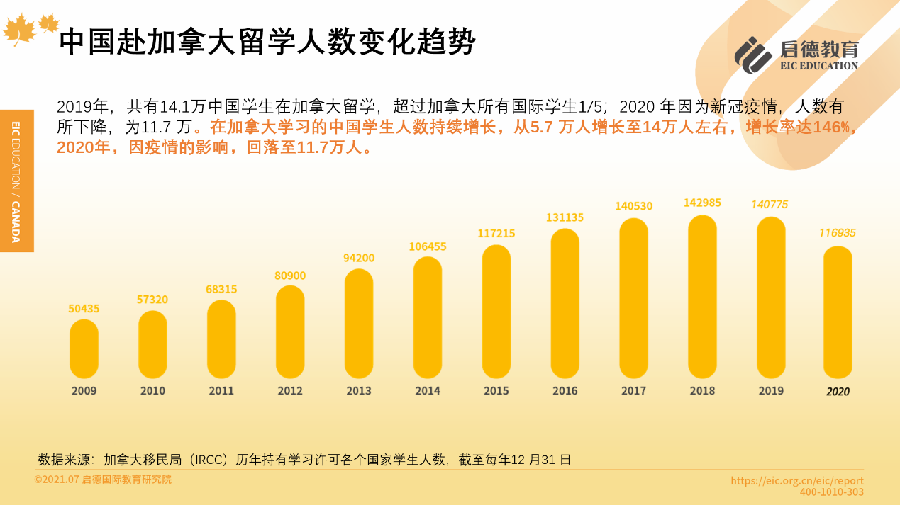 據(jù)加拿大移民局(IRCC)公布的數(shù)據(jù)顯示,2020年加拿大留學(xué)生來源國家排在前10位分別是:印度、中國、法國、美國、越南、尼日利亞、韓國、伊朗、巴西、孟加拉國。從2010年到2020年的11年間,在加拿大學(xué)習(xí)的中國學(xué)生人數(shù)持續(xù)增長,從5.7萬人增長至14萬人左右,增長率達(dá)146 %,2020年,因疫情的影響,回落至11.7萬人。