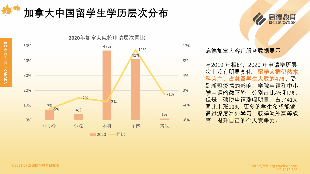 加拿大移民局?jǐn)?shù)據(jù)顯示,2020年入學(xué)的中國內(nèi)地學(xué)生中,大學(xué)(本、碩、博)階段占比為23.4%,學(xué)院占比7.4%,中小學(xué)占比55%。啟德留學(xué)客戶服務(wù)數(shù)據(jù)顯示,2020年通過啟德申請加拿大留學(xué)的學(xué)生中,本科與碩博的學(xué)生占比分別為47%與41%,學(xué)院和中小學(xué)分別占比4%與7%。