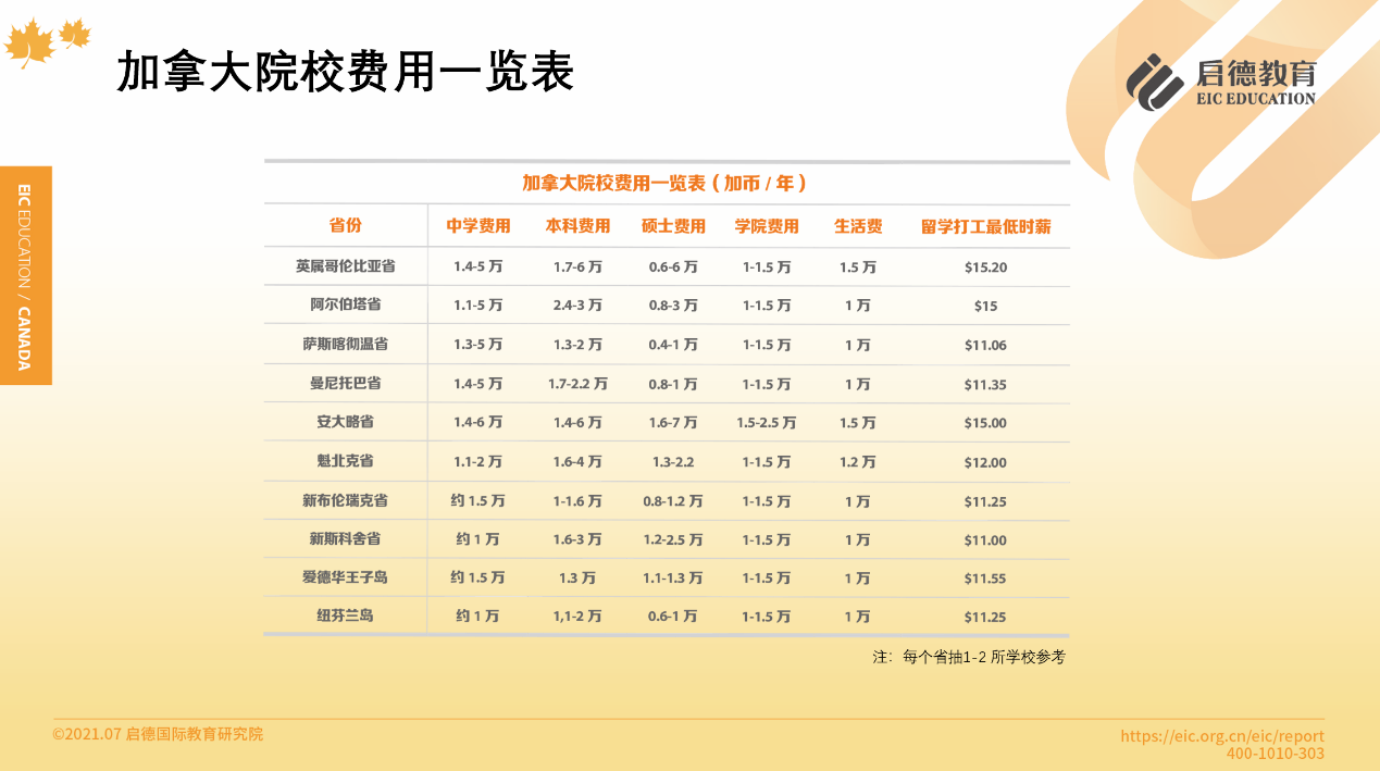 加拿大統(tǒng)計(jì)局?jǐn)?shù)據(jù)顯示,2019-2020學(xué)年加拿大國際留學(xué)生,本科平均學(xué)費(fèi)為29714加幣 /年 (同比上學(xué)年增漲7.6% ),約合16萬人民幣/年;碩士平均學(xué)費(fèi)水平為17744加幣 /年(同比上學(xué)年增漲4% ),約合10萬人民幣/年;生活費(fèi)1萬 -1.5萬加幣 /年,約合5.2萬-7.9萬人民幣/年,總留學(xué)費(fèi)用在美、英、澳、加四大熱門留學(xué)目的國中最低。此外,加拿大公立中學(xué)學(xué)費(fèi)、生活費(fèi)用共約14萬人民幣 /年,國際私立中學(xué)共約20萬人民幣 /年,私立本地精英中學(xué)共約20萬-28萬人民幣/年,私立貴族中學(xué)共約26萬 -40萬人民幣 /年。