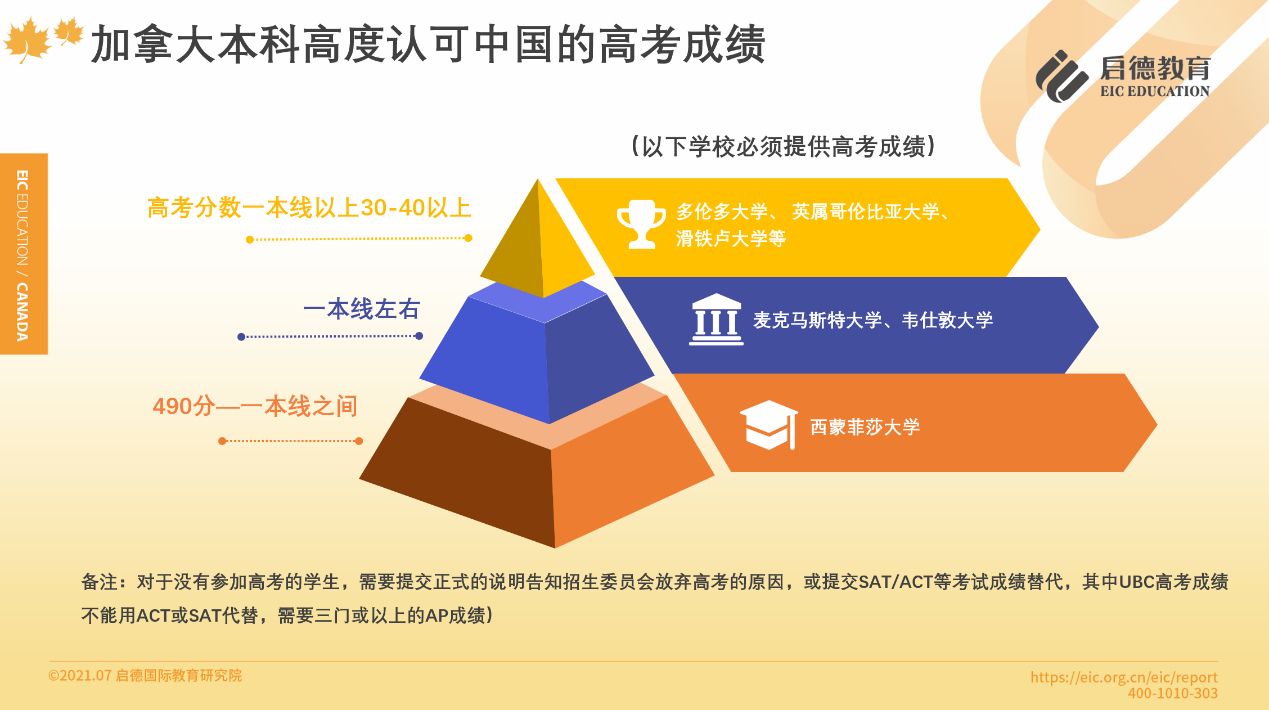加拿大本科認(rèn)可中國的高考成績,其中多倫多大學(xué)、英屬哥倫比亞大學(xué)、滑鐵盧大學(xué)等要求高考分?jǐn)?shù)一本線30-40分以上,麥克馬斯特大學(xué)、韋仕敦大學(xué)要求一本線左右,西蒙菲莎大學(xué)要求490分至一本線之間。沒有參加高考的學(xué)生,需要提交正式的說明告知招生委員會(huì)放棄高考的原因,或提交SAT/ACT等考試成績替代(其中英屬哥倫比亞大學(xué)高考成績不能用ACT或SAT代替,需要三門或以上的AP成績)。