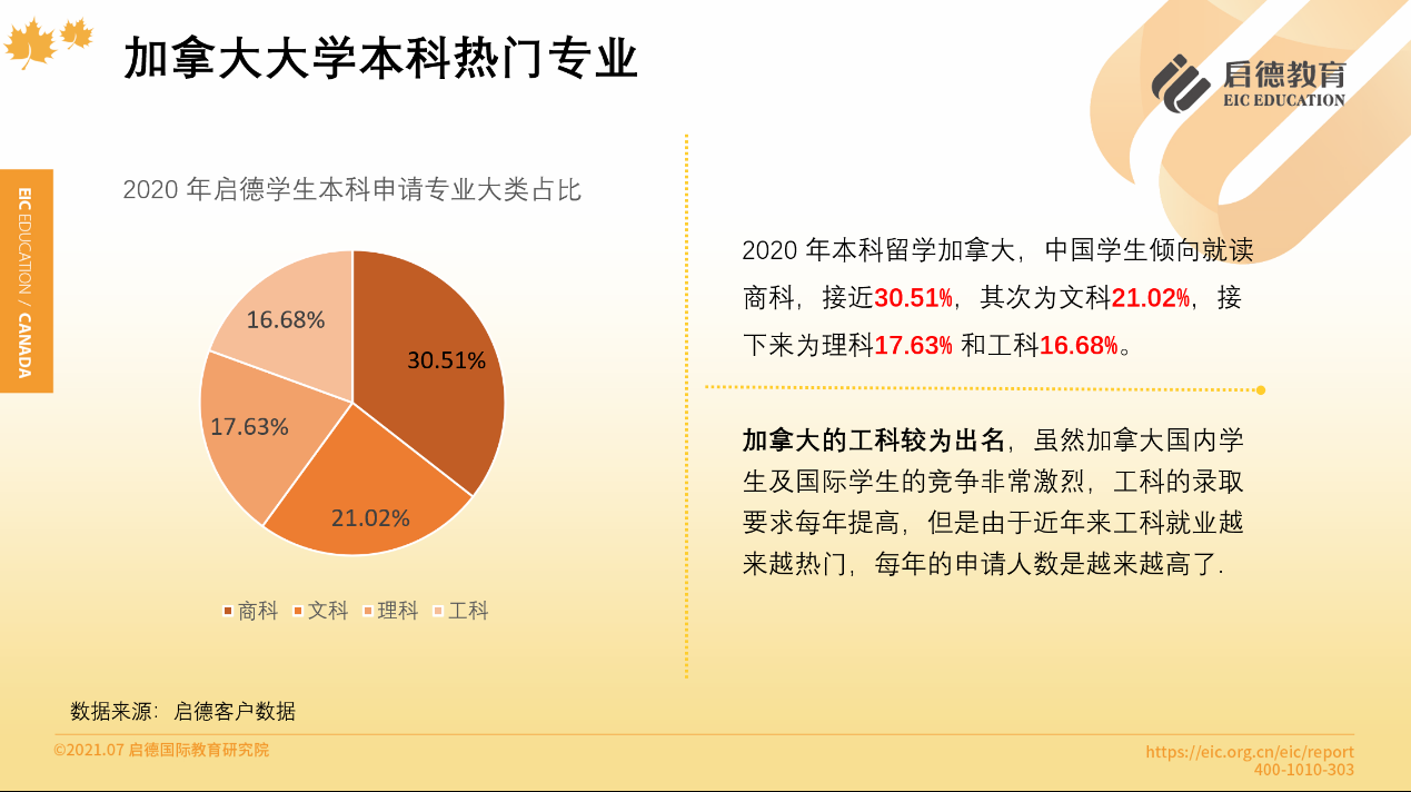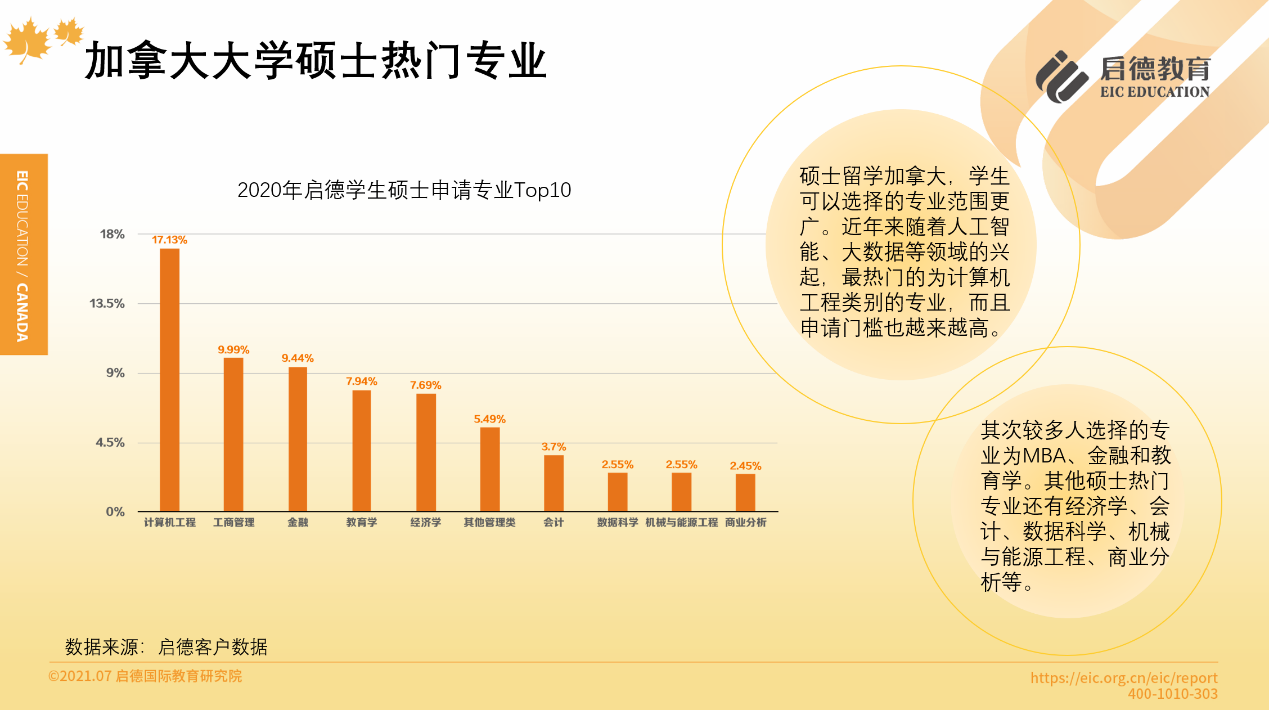 啟德留學(xué)客戶服務(wù)數(shù)據(jù)顯示,2020年加拿大本科階段,理工科專業(yè)占比34.31%,商科占比30.51%,文科21.02%,理工科的申請人數(shù)超過了商科。碩士階段選擇最多的專業(yè)是計(jì)算機(jī)工程(17.13% )、 MBA (9.99% )、金融(9.44% )與教育學(xué)(7.94% ),其他碩士熱門專業(yè)還有經(jīng)濟(jì)學(xué)、會(huì)計(jì)、數(shù)據(jù)科學(xué)、機(jī)械與能源工程、商業(yè)分析等。