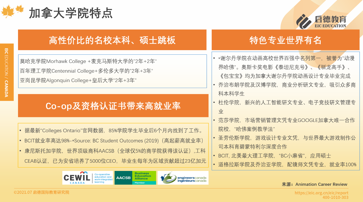 “ Colleges Ontario”官網(wǎng)數(shù)據(jù)顯示,85 %的學(xué)院學(xué)生畢業(yè)后6個(gè)月內(nèi)找到了工作,91%的雇主對學(xué)生表示非常滿意。如康尼斯托加學(xué)院,擁有世界頂級(jí)商科 AACSB與工科 CEAB認(rèn)證,為安省培養(yǎng)了5000位 CEO,畢業(yè)生每年為區(qū)域貢獻(xiàn)超過23億加元。而奧斯卡獎(jiǎng)電影《泰坦尼克號(hào)》、《馴龍高手》、《包寶寶》均為加拿大謝爾丹學(xué)院動(dòng)畫設(shè)計(jì)專業(yè)畢業(yè)完成。杜倫學(xué)院的人工智能專業(yè),道格拉斯學(xué)院的配鏡師專業(yè)也是世界有名的特色專業(yè)。