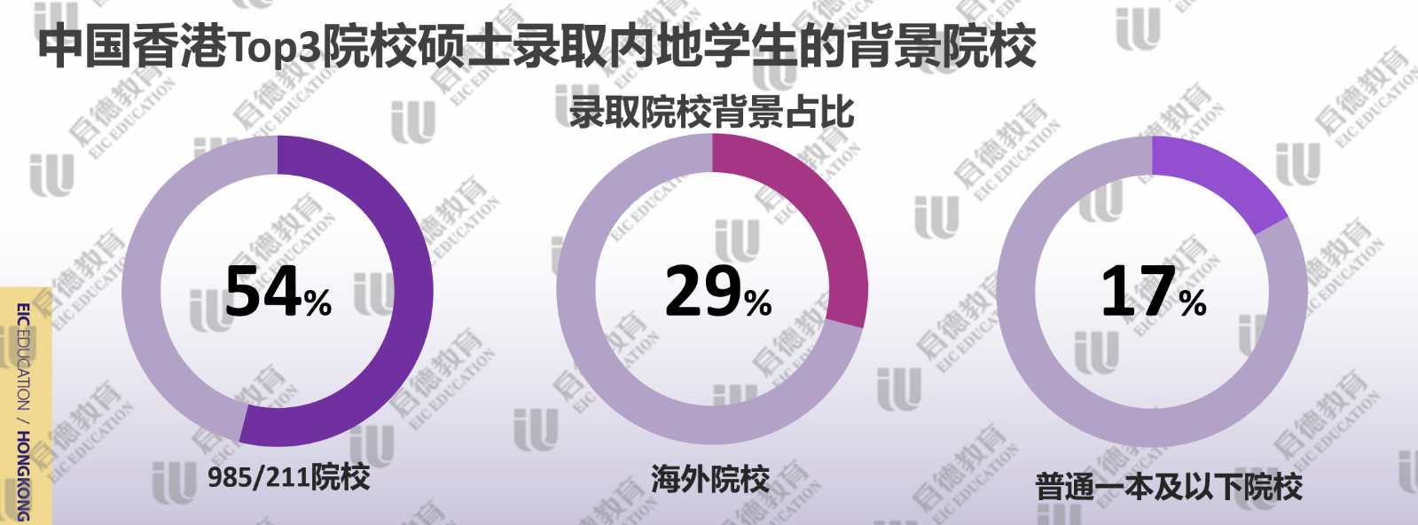 申請(qǐng)香港高校提交雅思成績(jī)較多,啟德留學(xué)2021客戶服務(wù)數(shù)據(jù)顯示,近3成錄取學(xué)生雅思成績(jī)達(dá)到7分或以上,主要集中在金融、會(huì)計(jì)、傳媒、英語教育等熱門專業(yè);雅思達(dá)到6.5分占比幾乎一半,代表了香港高校錄取學(xué)生的平均水平;雅思6分占比不到四分之一,主要分布于理工科或冷門專業(yè)。香港TOP3名校(香港大學(xué)、香港科技大學(xué)、香港中文大學(xué))錄取的碩士學(xué)生中,985/211院校背景的學(xué)生超過了一半;因疫情因素導(dǎo)致海外留學(xué)生的回流,近30%的碩士學(xué)生來自于海外院校本科;雙非院校的占比僅為17%,集中于需要豐富實(shí)習(xí)和工作經(jīng)驗(yàn)的理工科。擁有實(shí)習(xí)/科研等經(jīng)歷占比為99%,其中,超八成學(xué)生完成了3次以上的實(shí)習(xí)/科研。
