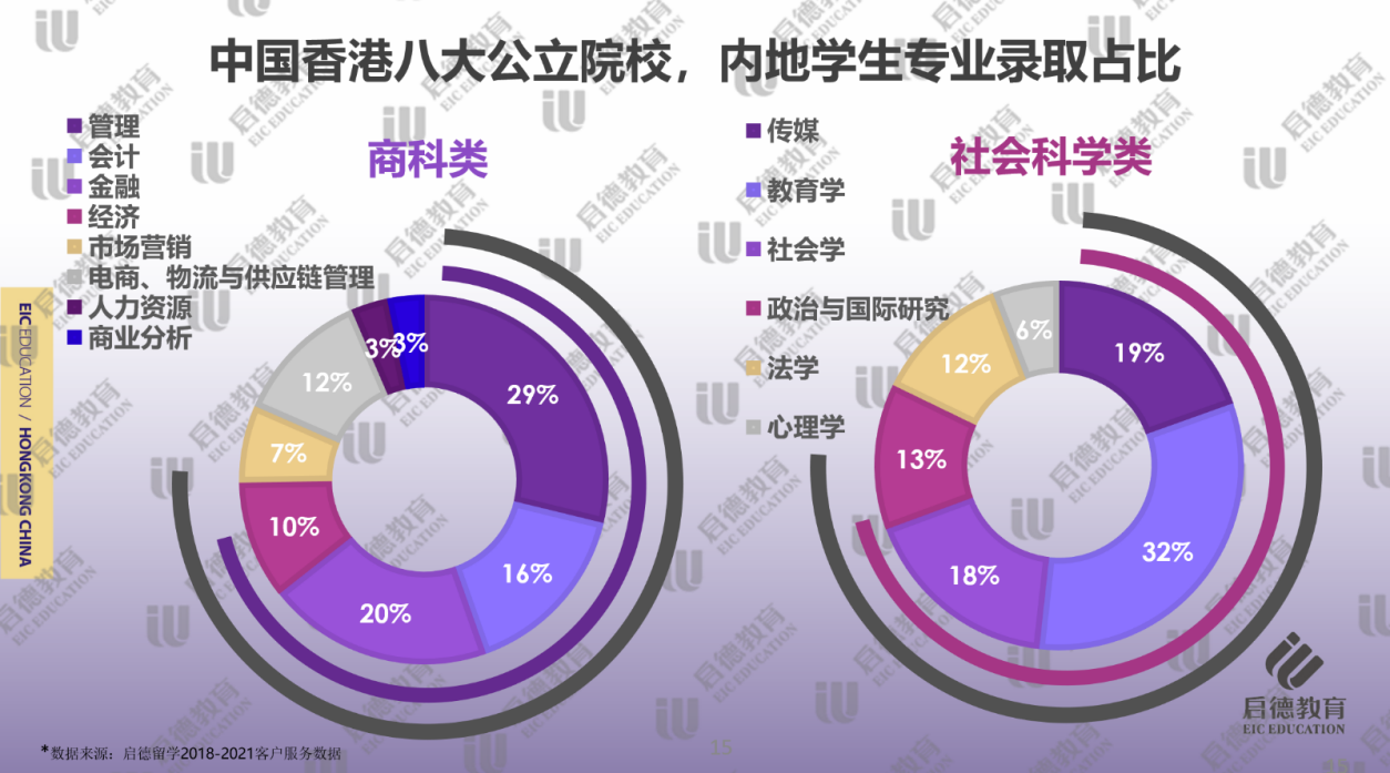 在社會(huì)科學(xué)類學(xué)科的細(xì)分專業(yè)中,教育學(xué)(32% )、傳媒(19% )和社會(huì)學(xué)(18% )的錄取占比較高。由于教育類專業(yè)在內(nèi)地就業(yè)形勢(shì)好,香港院校不僅教育學(xué)排名靠前,還擁有適合內(nèi)地學(xué)生的中文教育及對(duì)外漢語教育等課程,教育學(xué)專業(yè)在文科生中比重一直居于首位。隨著新媒體行業(yè)的崛起,處于亞洲龍頭地位的香港傳媒專業(yè)也是倍受歡迎。而“公考熱”的持續(xù)使得希望提升學(xué)歷背景的學(xué)生,會(huì)考慮繼續(xù)深造社會(huì)學(xué)、政治與國(guó)際研究此類課程。