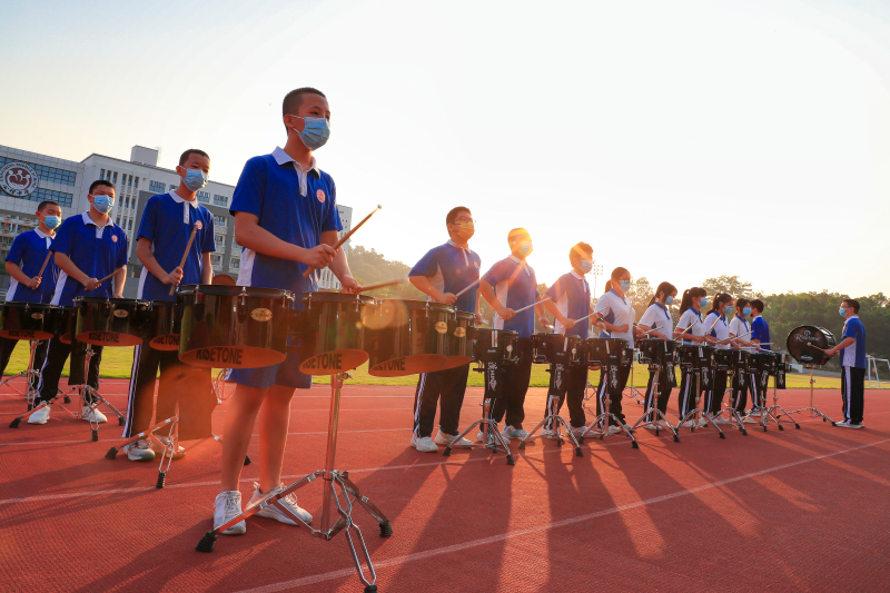公明中學(xué)打擊樂團用歡快的鼓聲為學(xué)子們加油助威。(公明中學(xué)供圖)