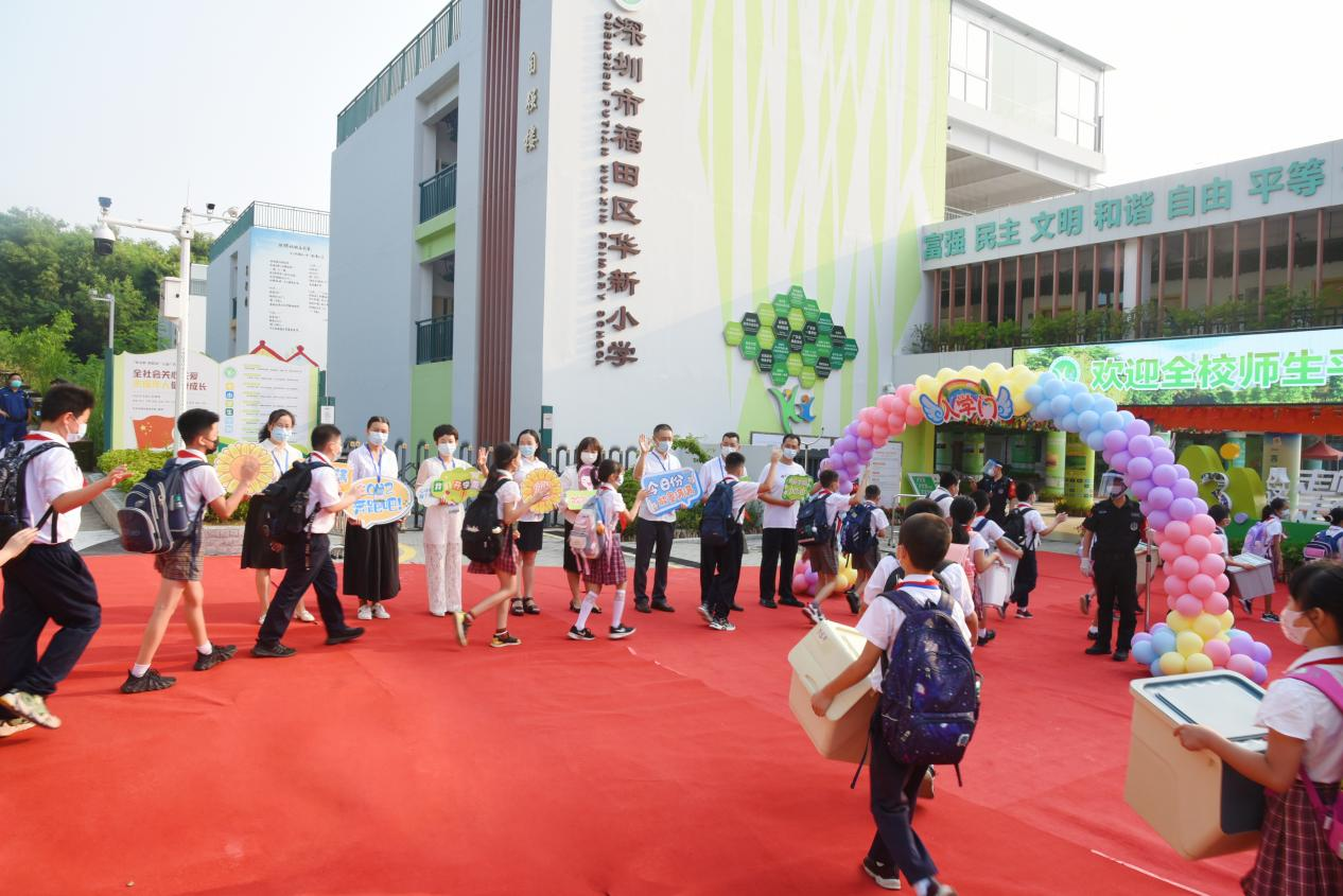 “同學(xué)們好!歡迎你們回家!”9月20日一早,華新小學(xué)校長張偉帶領(lǐng)老師們、家長義工們在校門口迎候四至六年級學(xué)生返校。同學(xué)們背著書包,抱著午托箱,迎著朝陽,踏著紅毯意氣風(fēng)發(fā)走進“入學(xué)門”。校領(lǐng)導(dǎo)、老師和家長義工們熱情迎接同學(xué)們平安返校,學(xué)生們從此告別漫長的暑假,開啟新學(xué)期的校園學(xué)習(xí)生活。