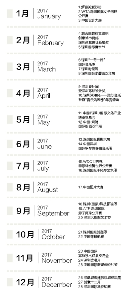 往細里說,“城市文化菜單”呈現出鮮明亮點:一是國際化程度高。大部分活動都有國際權威和國家級專業(yè)機構主辦或授權支持,不少活動代表了我國這一領域的最高水準,是可以代表深圳國際化城市形象的“文化大餐”。二是內容豐富多彩。這份“菜單”表面上看只有28項,實際上每項活動時間跨度從幾天到一個多月不等,由十數項甚至上百項活動組成,各款“菜式”都有,不同口味的人都可以自行“看單點菜”。三是體現深圳特色。“菜單”中有三分之一的活動與創(chuàng)新創(chuàng)意有關,正好體現了深圳“創(chuàng)新之城”、“設計之都”的城市特性,可謂是深圳的文化“特產”。四是新的品牌活動首次集體亮相。經過多年培育,深圳已經擁有文博會、高交會、讀書月、創(chuàng)意12月等傳統(tǒng)品牌活動,接下來還要精心打造一系列新的文化品牌活動。在這份“菜單”中,2016年及今年新創(chuàng)辦的就有深圳“一帶一路”國際音樂季、深圳國際科技影視周、深圳國際攝影大展、深圳設計周、中國圖片大賽等多項活動,文博會、新春關愛行動、國際魔術節(jié)等老牌活動也都將有新的策劃、新的提升,更具國際化內涵。一句話,這份菜單共匯集了國際化、標志性的品牌文化活動28項,涵蓋文化藝術、創(chuàng)意設計、科技創(chuàng)新、體育休閑等多個類別,是廣義的文化活動的概念。