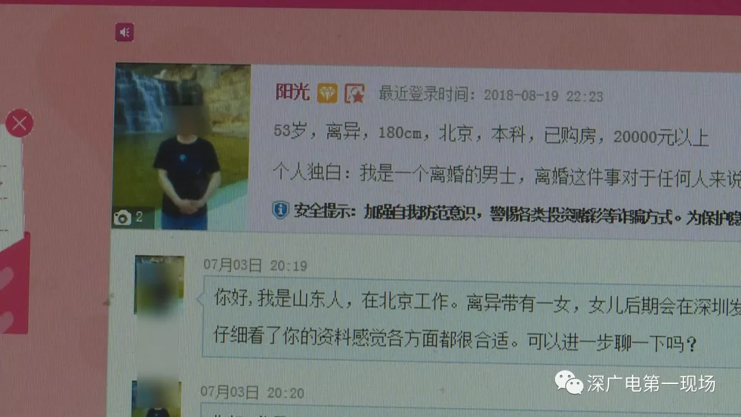 張女士說,她在三年前離了婚,如今兒子已經(jīng)大學(xué)畢業(yè),想著為自己的下半生找個依靠,于是張女士便在世紀(jì)佳緣網(wǎng)站花了三百多元注冊了會員。7月初世紀(jì)佳緣網(wǎng)站上一個名叫“陽光”的北京網(wǎng)友聯(lián)系了她。