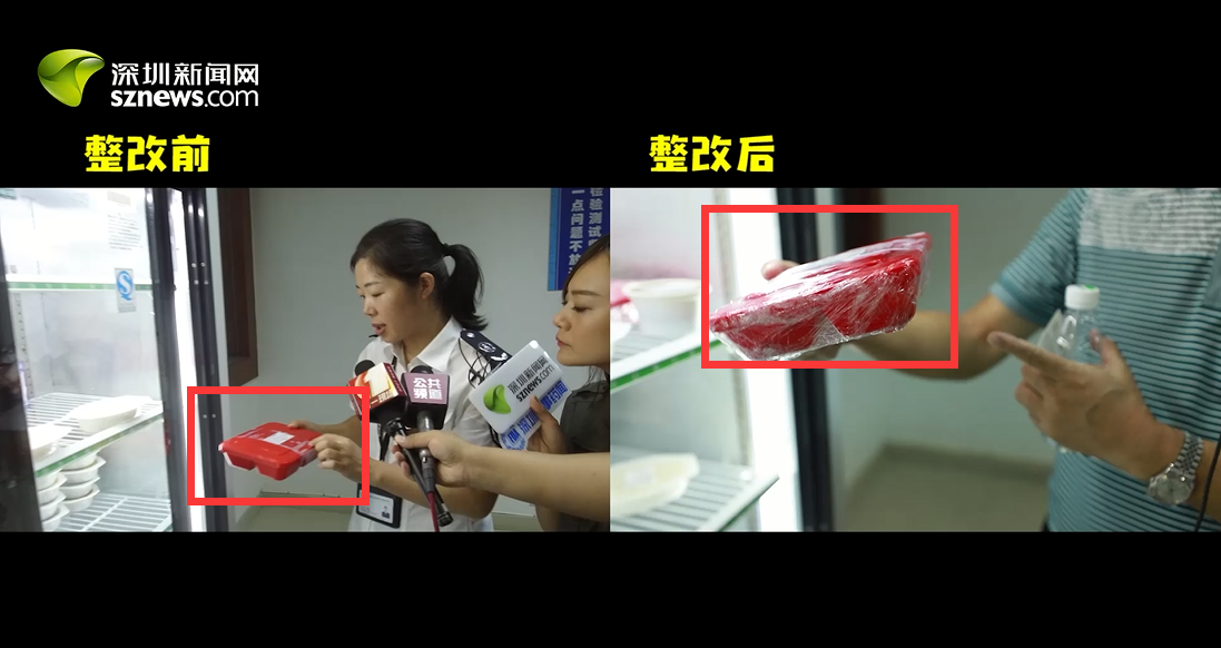 29日突查發(fā)現(xiàn),該公司留樣柜“留樣食品有漏汁”。今日深圳新聞網(wǎng)回訪發(fā)現(xiàn),該問(wèn)題已得到整改,留樣食品已用保鮮膜密封。