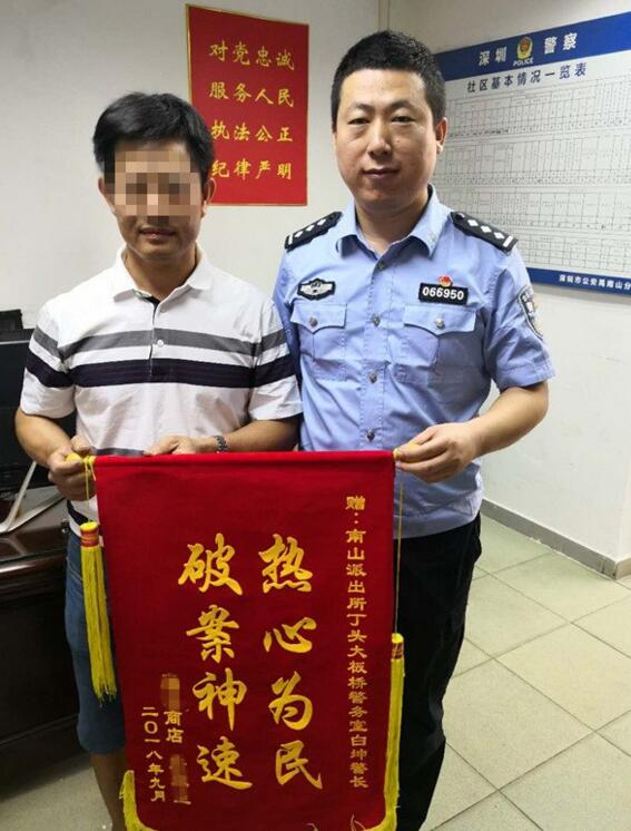 9月12日下午,事主唐先生親自帶著一面寫有"破案神速,熱心為民"的錦旗到丁頭大板橋警務(wù)室,對南山派出所丁頭社區(qū)民警及巡防員及時(shí)為其找回被盜手機(jī)表示感謝和贊揚(yáng)。(記者 羅典 通訊員 龍威 唐婷)