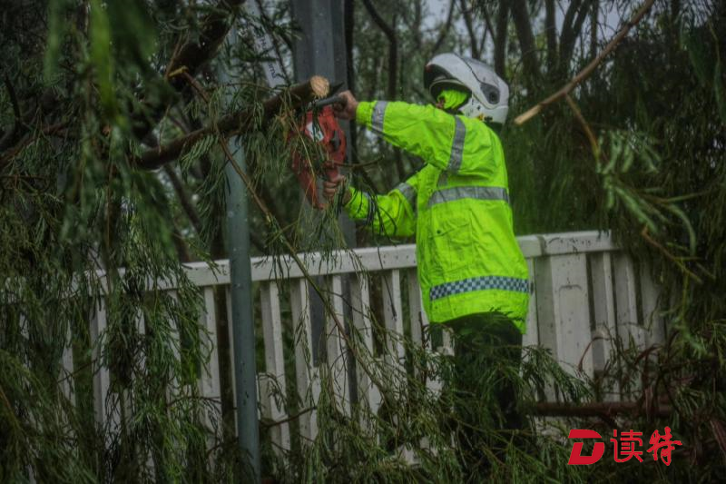 在9月18日新聞聯(lián)播中播放的臺(tái)風(fēng)現(xiàn)場畫面中,有一段正是艾力軍4人在羅沙路上清除路障過程中記錄的。當(dāng)時(shí),艾力軍正拿起手機(jī)為同事記錄,突然一陣狂風(fēng)猛掃過來,姚書龍、陳展聰尚能在風(fēng)中勉強(qiáng)站住,而陳展廷卻因站立不穩(wěn)被風(fēng)吹著跑了近10米才停下。所幸,陳展廷抓住路邊的護(hù)欄才沒被吹倒。這段視頻在最近兩天也在社交軟件中廣為流傳,3位“小黃人”中2人頂風(fēng)艱難站立,1人被風(fēng)吹跑,看似“滑稽”的畫面中仔細(xì)品味,超強(qiáng)臺(tái)風(fēng)中堅(jiān)守崗位的艱辛在視頻中盡顯無疑。