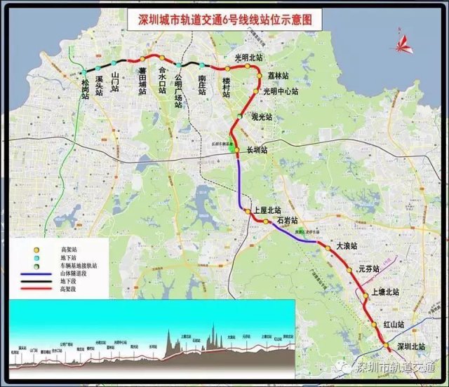 深圳地鐵6號線全長約49.4km,其中一期工程長約37.6km,起自深圳北站綜合交通樞紐,終于松崗站,設車站20座(其中地下站5座,高架站15座),與4、5、11、13、15號線及廣深港客運專線綜合換乘。