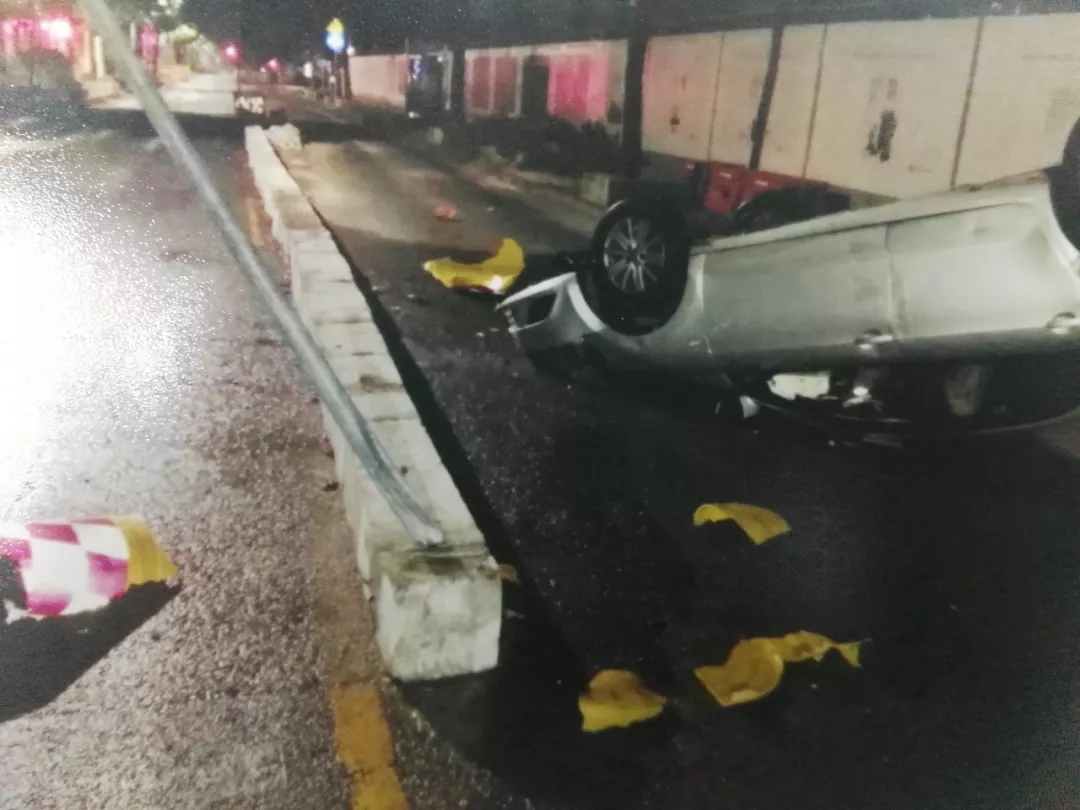 開車犯迷糊,自己撞水泥墩上,來了個底朝天