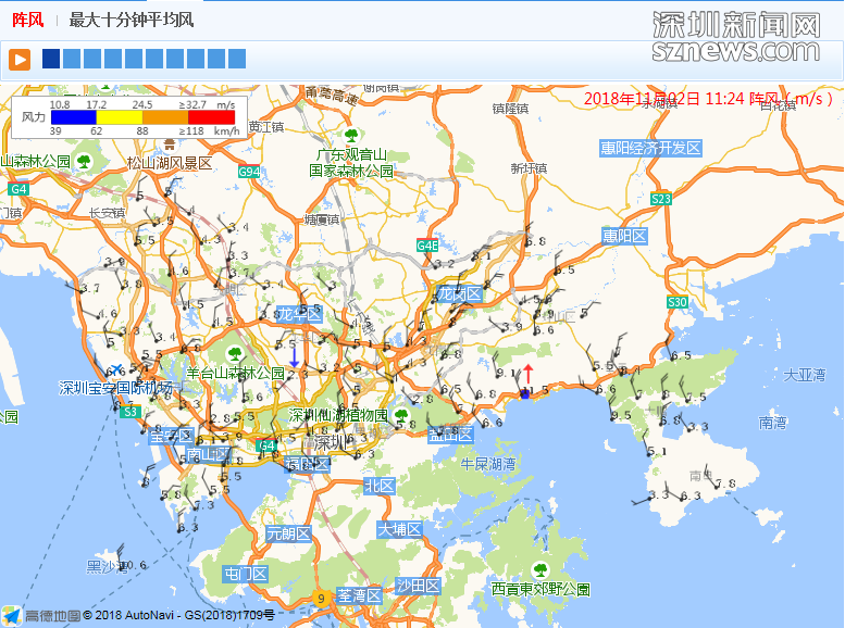 市氣象臺(tái)于11月2日11時(shí)24分發(fā)布最大十分鐘平均風(fēng)值