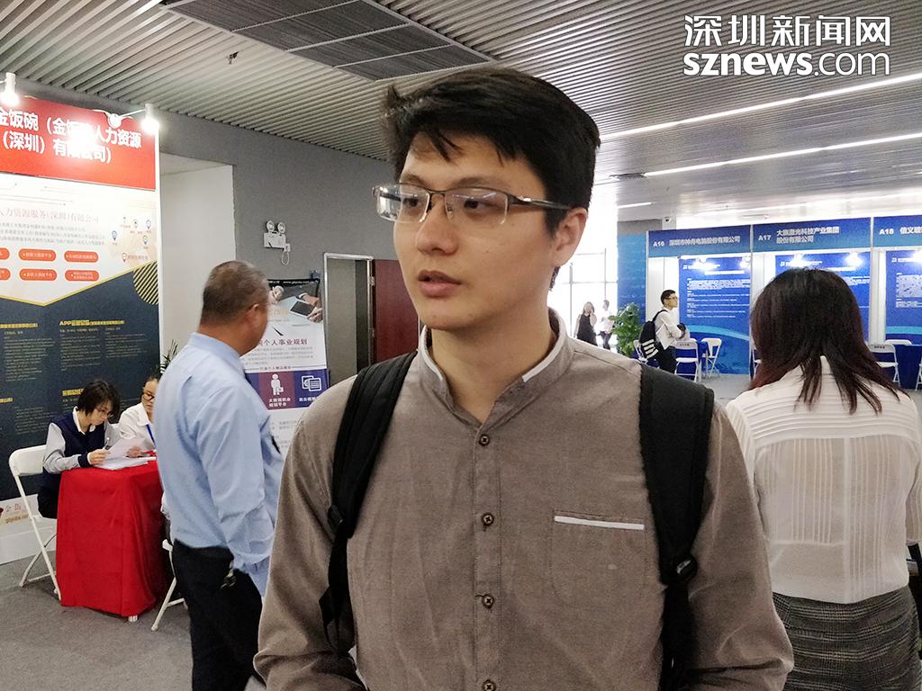 現(xiàn)場應聘的劉先生已有一年的工作經(jīng)驗,此次高端人才招聘會的信息是通過深圳市人力資源社會保障局的微信公眾號得知,故來到現(xiàn)場希望尋得一個對口的崗位。