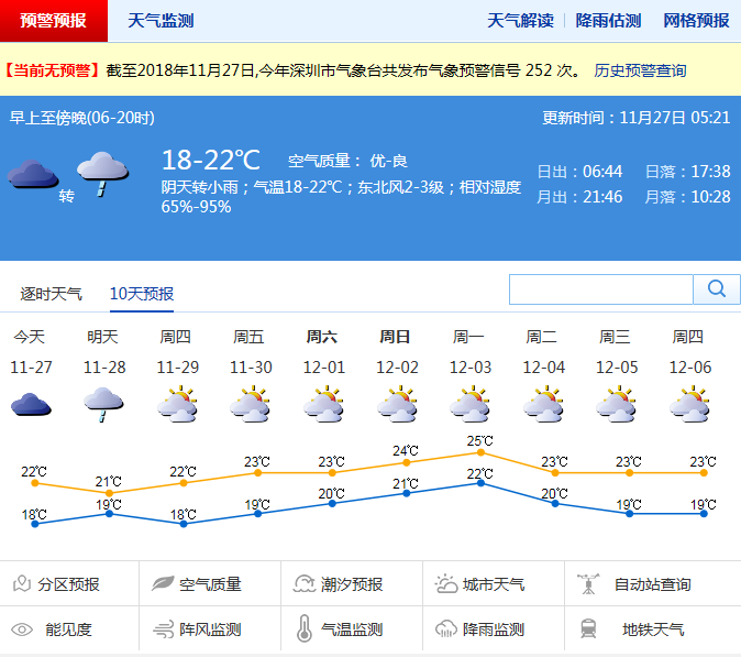 深圳新聞網(wǎng)11月27日訊(記者 陳婕)一場(chǎng)秋雨一場(chǎng)寒,市氣象臺(tái)預(yù)測(cè),未來(lái)幾日秋雨綿綿,氣溫為17-22℃,下雨時(shí)能見(jiàn)度較低,出行注意安全。