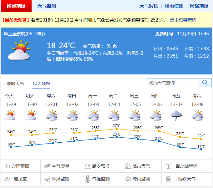 深圳新聞網(wǎng)11月29日訊(記者 陳婕)11月29日深圳最高氣溫24°,多云間晴天;氣溫18-24℃;東風(fēng)2-3級,陣風(fēng)5-6級;相對濕度65%-95%。