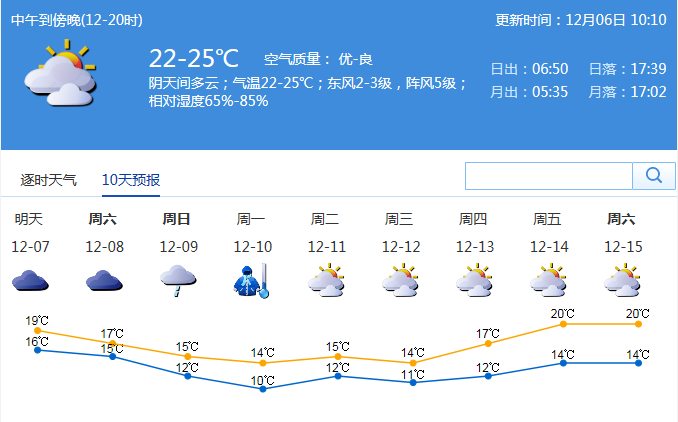 市氣象局發(fā)布未來十天天氣預報(數(shù)據(jù)更新于12月06日10時10分)