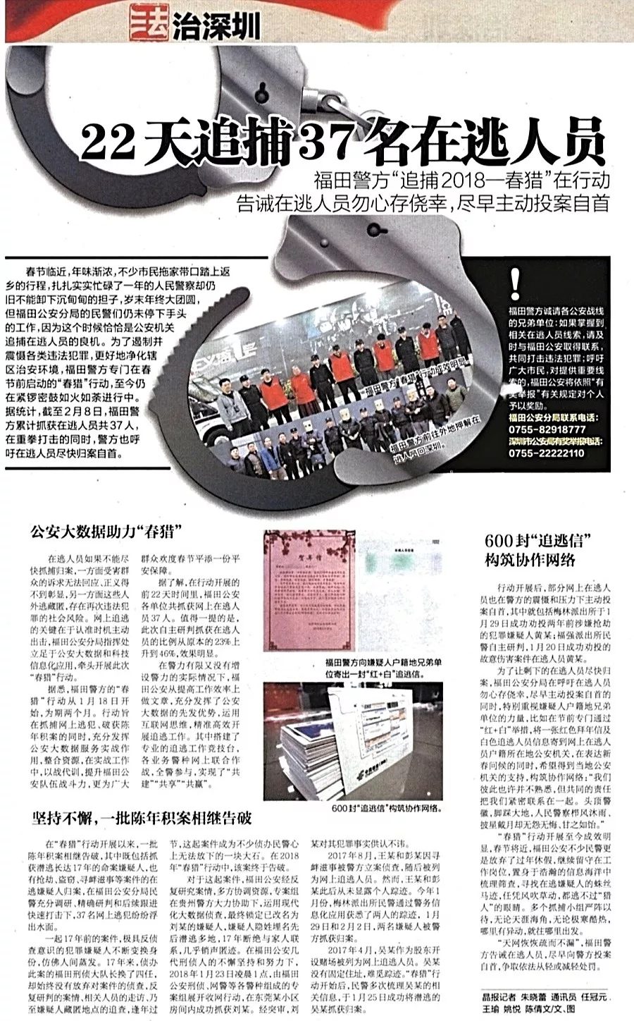 ★★春節(jié)臨近,萬家團(tuán)圓,福田公安分局的民警卻更忙了。他們?yōu)榱硕糁普饝馗黝愡`法犯罪,凈化轄區(qū)治安環(huán)境,專門在春節(jié)前啟動(dòng)“春獵”行動(dòng),劍指負(fù)案在逃的犯罪嫌疑人,行動(dòng)截止2月8日,警方累計(jì)抓獲在逃人員37人。
