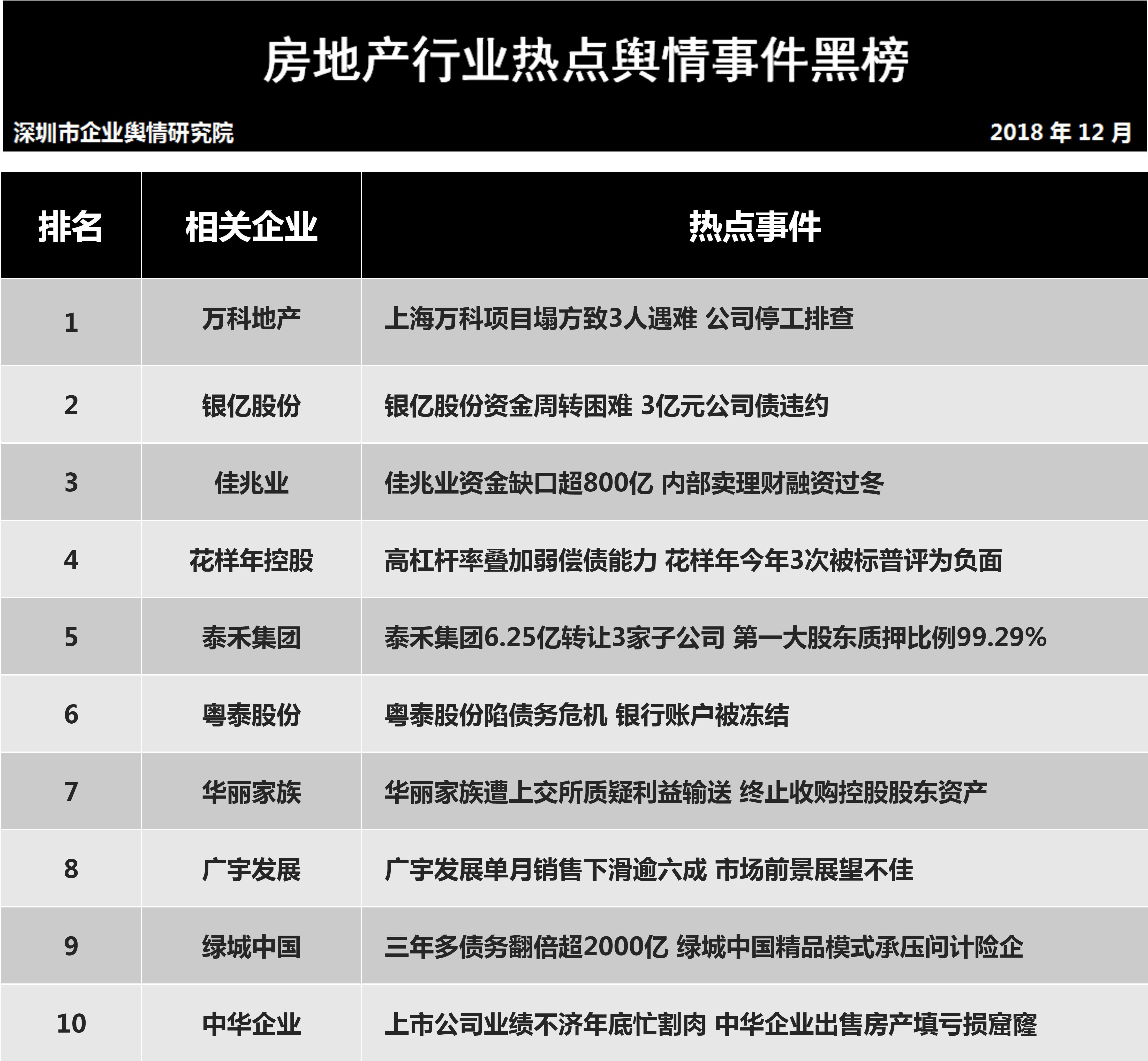 深圳新聞網(wǎng)2019年1月7日訊 (記者田志強(qiáng) 通訊員陳文光)1月7日,深圳企業(yè)輿情研究院發(fā)布第十一批企業(yè)輿情榜單。本次榜單重點(diǎn)聚焦房地產(chǎn)及醫(yī)藥保健兩個(gè)行業(yè)。房地產(chǎn)行業(yè)企業(yè)輿情榜單由房地產(chǎn)行業(yè)熱點(diǎn)輿情事件排行榜(紅、黑榜)及房地產(chǎn)企業(yè)公眾形象排行榜組成。