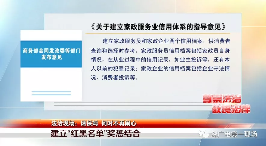 趙坤:在深圳,請保姆,育嬰師,鐘點(diǎn)工等等是很多家庭的剛需,但是很多人也抱怨說,要請個(gè)好的保姆阿姨實(shí)在是太難了,有些雇主因?yàn)楦鞣N原因家里來來去去換了好幾個(gè)阿姨,有些甚至還跟家政公司調(diào)解不成鬧上了法庭。防患于未然,商務(wù)部等部委這次發(fā)布的意見,建立信用檔案,可謂來的正當(dāng)時(shí)。我們也期待深圳能盡快出臺(tái)家政行業(yè)信用平臺(tái),期待深圳的家政行業(yè)能更加透明,更加規(guī)范。