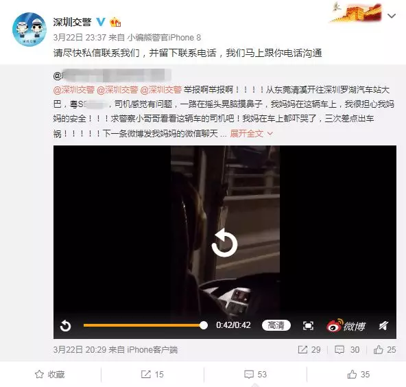 “舉報(bào)啊舉報(bào)?。。?!大巴車三次差點(diǎn)出車禍!司機(jī)一路搖頭晃腦摸鼻子?。。?!”3月22日晚,深圳交警在微博上接到網(wǎng)友舉報(bào)。