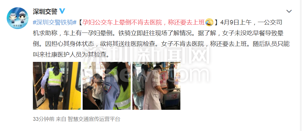 深圳新聞網(wǎng)2019年4月9日訊(記者 施冰冰)記者從“深圳交警”處了解到,4月9日上午,有公交司機求助稱,車上有一孕婦暈倒。鐵騎立即趕往現(xiàn)場了解情況。據(jù)了解,女子未沒吃早餐導(dǎo)致暈倒。因擔(dān)心其身體狀態(tài),欲將其送往醫(yī)院檢查。女子不肯去醫(yī)院,稱還要去上班。隨后隊員只能叫來社康醫(yī)護(hù)人員為其檢查。