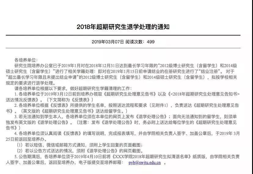 對于"超出最長學(xué)習(xí)年限且未提出結(jié)業(yè)申請"的2012級博士研究生(含留學(xué)生)和2014級碩士研究生(含留學(xué)生),擬按學(xué)校相關(guān)規(guī)定的要求進(jìn)行退學(xué)處理。