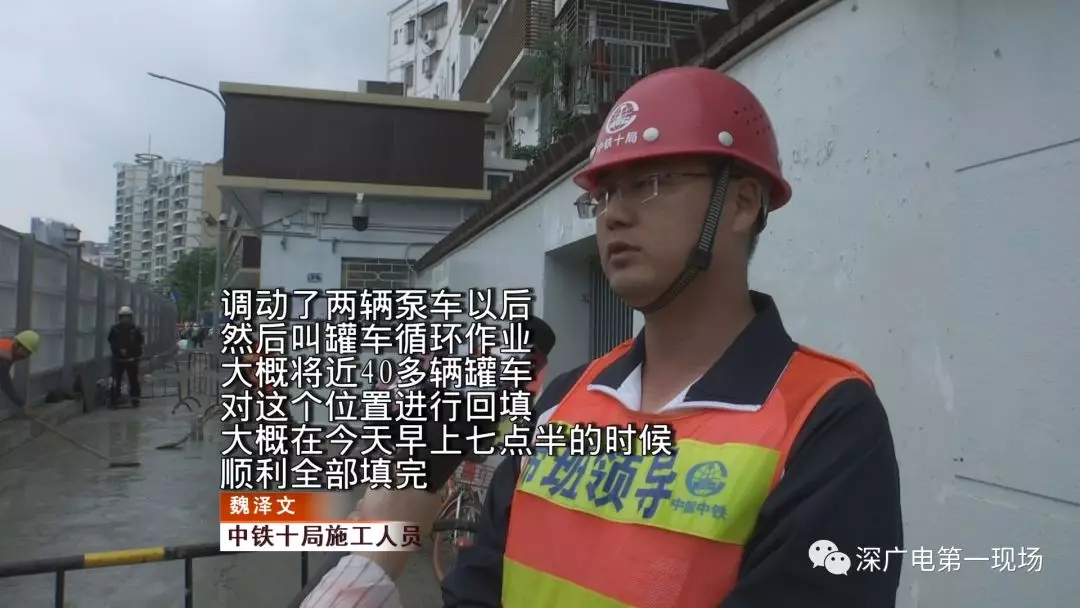 路面坍塌情況發(fā)生后,該路段也第一時(shí)間被封閉,由附近的桂廟路快速化改造工程二標(biāo)施工方中鐵十局進(jìn)行應(yīng)急處置,往塌陷位置灌注混凝土。