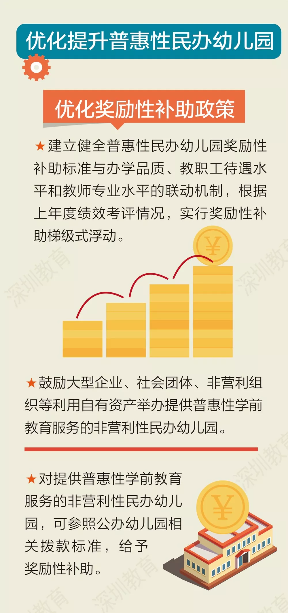 深圳公辦園建設(shè)策略將以市政府主導統(tǒng)籌推進動,各區(qū)政府履行主體責任,挖掘各街道潛力,圍繞各社區(qū)布點,力爭每個社區(qū)有1-2所公辦園,每年新建2萬個以上學前教育學位。加大幼兒園規(guī)劃與建設(shè)力度,鼓勵社會力量興辦幼兒園和其他類型學前教育機構(gòu)。