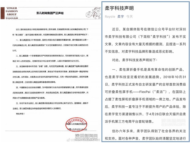 影兒時(shí)尚集團(tuán)(左)和柔宇科技(右)聲明頁(yè)面截圖