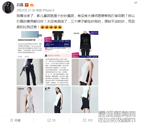 無獨(dú)有偶。5月5日,深圳影兒時(shí)尚集團(tuán)(以下簡(jiǎn)稱:影兒集團(tuán))正式向深圳市中級(jí)人民法院提起訴訟請(qǐng)求,就超模呂燕多次在微博上指責(zé)影兒集團(tuán)是“抄抄集團(tuán)”,造成影兒集團(tuán)重大名譽(yù)損失和巨額經(jīng)濟(jì)損失一事,起訴超模呂燕及其公司上海是你商貿(mào)有限公司不正當(dāng)競(jìng)爭(zhēng),要求兩被告立即停止侵權(quán)行為,賠償經(jīng)濟(jì)損失1000萬元,并公開道歉。