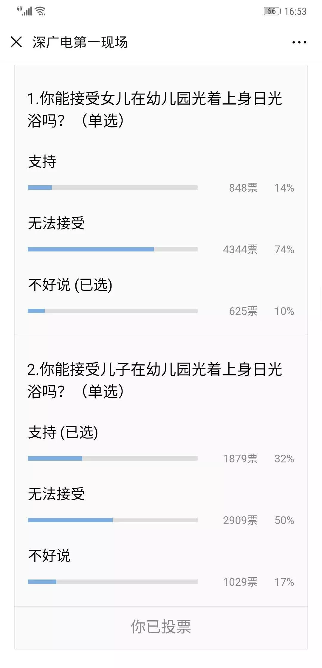 節(jié)目播出后,在第一現(xiàn)場微信公眾號(hào)上進(jìn)行的話題投票中,有74%的觀眾都認(rèn)為無法接受女兒在幼兒園光著上身日光浴,另外有50%的人認(rèn)為無法接受兒子進(jìn)行同樣的行為。
