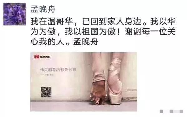 當(dāng)?shù)貢r間2018年12月1日,加拿大當(dāng)局應(yīng)美方要求,扣留了在加拿大機場轉(zhuǎn)機的孟晚舟,美國隨后承認(rèn),正在尋求對孟晚舟的引渡。10天之后,2018年12月11日,加拿大法院作出裁決,批準(zhǔn)孟晚舟的保釋申請。當(dāng)晚,走出法庭的孟晚舟發(fā)朋友圈表示,我以華為為傲,我以祖國為傲。配圖就是那張“芭蕾腳”的華為廣告圖,上面寫著:偉大的背后都是苦難。外界擔(dān)心,由于不斷升級的中美貿(mào)易摩擦,可能會影響到孟晚舟在加拿大的引渡訴訟。