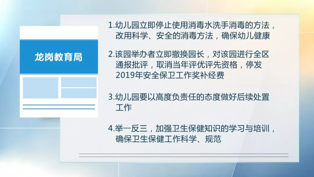 5月24日,龍崗區(qū)教育局了解到該情況后,立即派工作人員到幼兒園進(jìn)行調(diào)查。經(jīng)查,該園出現(xiàn)“皰疹性咽頰炎”后,違規(guī)使用強(qiáng)力消毒粉兌水給幼兒洗手消毒,存在衛(wèi)生保健上嚴(yán)重錯(cuò)誤。