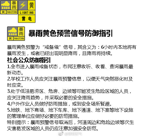 市民注意收聽、收看、查詢暴雨最新動(dòng)態(tài)。學(xué)校工作人員應(yīng)關(guān)注暴雨預(yù)警信息,以便天氣突然惡化時(shí)及時(shí)應(yīng)變。處于低洼易澇區(qū)、危房、邊坡等可能發(fā)生危險(xiǎn)區(qū)域的人員,應(yīng)關(guān)注降雨趨勢(shì),并采取必要的安全措施。戶外作業(yè)人員做好防雨措施,或到安全場(chǎng)所暫避。5.地鐵、地下商場(chǎng)、地下車庫、地下通道、地下室等地下設(shè)施的管理單位應(yīng)做好必要的防范措施。特別提示:暴雨預(yù)警信號(hào)取消后,河道周邊和危險(xiǎn)邊坡等次生災(zāi)害易發(fā)區(qū)域的人員仍應(yīng)注意加強(qiáng)安全防范。