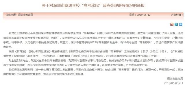 5月12日晚,深圳市教育局發(fā)布《關(guān)于對深圳市富源學(xué)?!案呖家泼瘛闭{(diào)查處理進展情況的通報》,通報稱,經(jīng)查實,深圳市富源學(xué)校2019年高考報名考生中,有32名考生屬“高考移民”,弄虛作假獲取廣東省報考資格。按照相關(guān)法例,對涉事32名學(xué)生取消在深圳市的高考報名資格,對深圳市富源學(xué)校予以行政處罰,核減該校2019年高中招生計劃的50%;責(zé)成深圳市富源學(xué)校董事會作出深刻檢查,責(zé)令深圳市富源學(xué)校對直接責(zé)任人及有關(guān)負責(zé)人進行嚴(yán)肅處理,認(rèn)真整改存在問題,嚴(yán)格規(guī)范辦學(xué)行為。