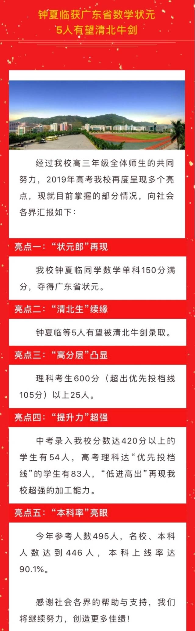 學(xué)校稱其2019年高?!案叻謱印蓖癸@,理科考生600分(超出優(yōu)先投檔線105分)以上25人;“本科率”亮眼,今年參考人數(shù)495人,名校、本科人數(shù)達到446人,本科上線率達90.1%;此外,還提到“提升力”,稱中考錄入該校分?jǐn)?shù)達420分以上的學(xué)生有54人,高考理科達“優(yōu)先投檔線”的學(xué)生有83人,實現(xiàn)“低進高出”。