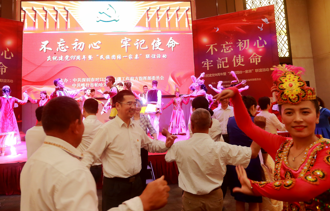深圳新聞網(wǎng)2019年7月1日訊 盛夏七月,紅色黨旗迎風(fēng)飄,為積極響應(yīng)黨中央關(guān)于在全黨開展“不忘初心牢記使命”主題教育的重大部署。6月30日,深圳援疆前方指揮部、中共喀什市帕哈太克里鄉(xiāng)委員會聯(lián)合組織開展慶祝建黨98周年暨“民族團(tuán)結(jié)一家親聯(lián)誼”活動??κ驳貐^(qū)行署領(lǐng)導(dǎo)、全體援疆干部人才、帕哈太克里鄉(xiāng)結(jié)親群眾等300余人參與活動。