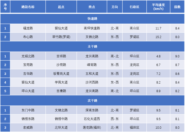 早高峰十大交通運行惡化街道:華強北、南湖、香蜜湖、翠竹、蓮塘、招商、蓮花、桃源、華富及園嶺。