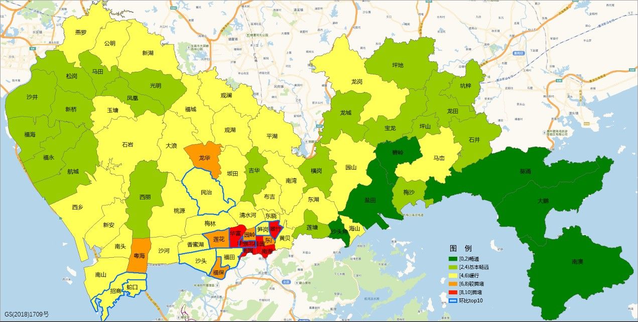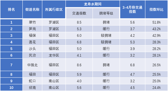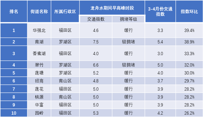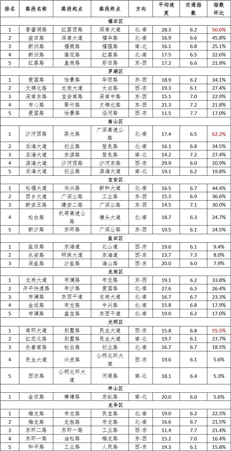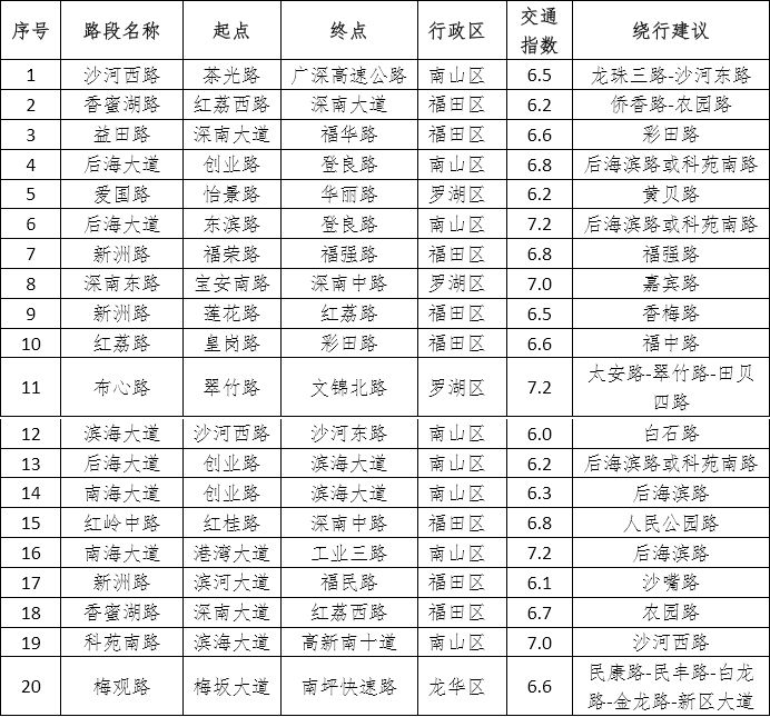 晚高峰十大交通運行惡化街道:翠竹、筍崗、福保、蓮花、沙頭、民治、華強北、福田、蛇口、招商。