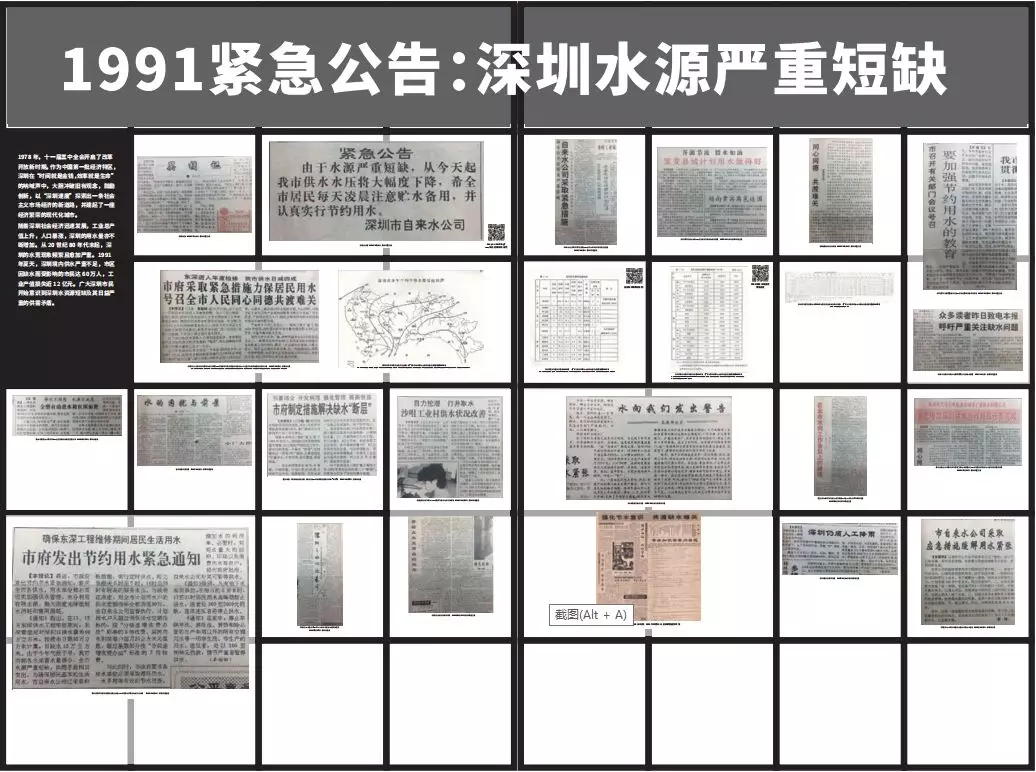 第一部分以“1991緊急公告:深圳水源嚴(yán)重短缺”為題,透過多份1991年深圳水荒的相關(guān)報(bào)道以及有關(guān)資料,讓觀者了解一個(gè)曾經(jīng)極度缺水的深圳。
